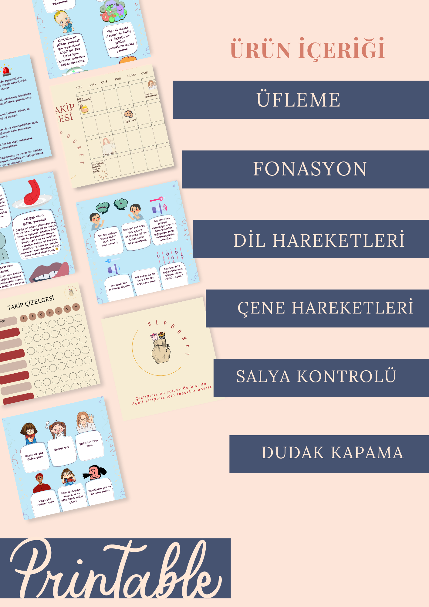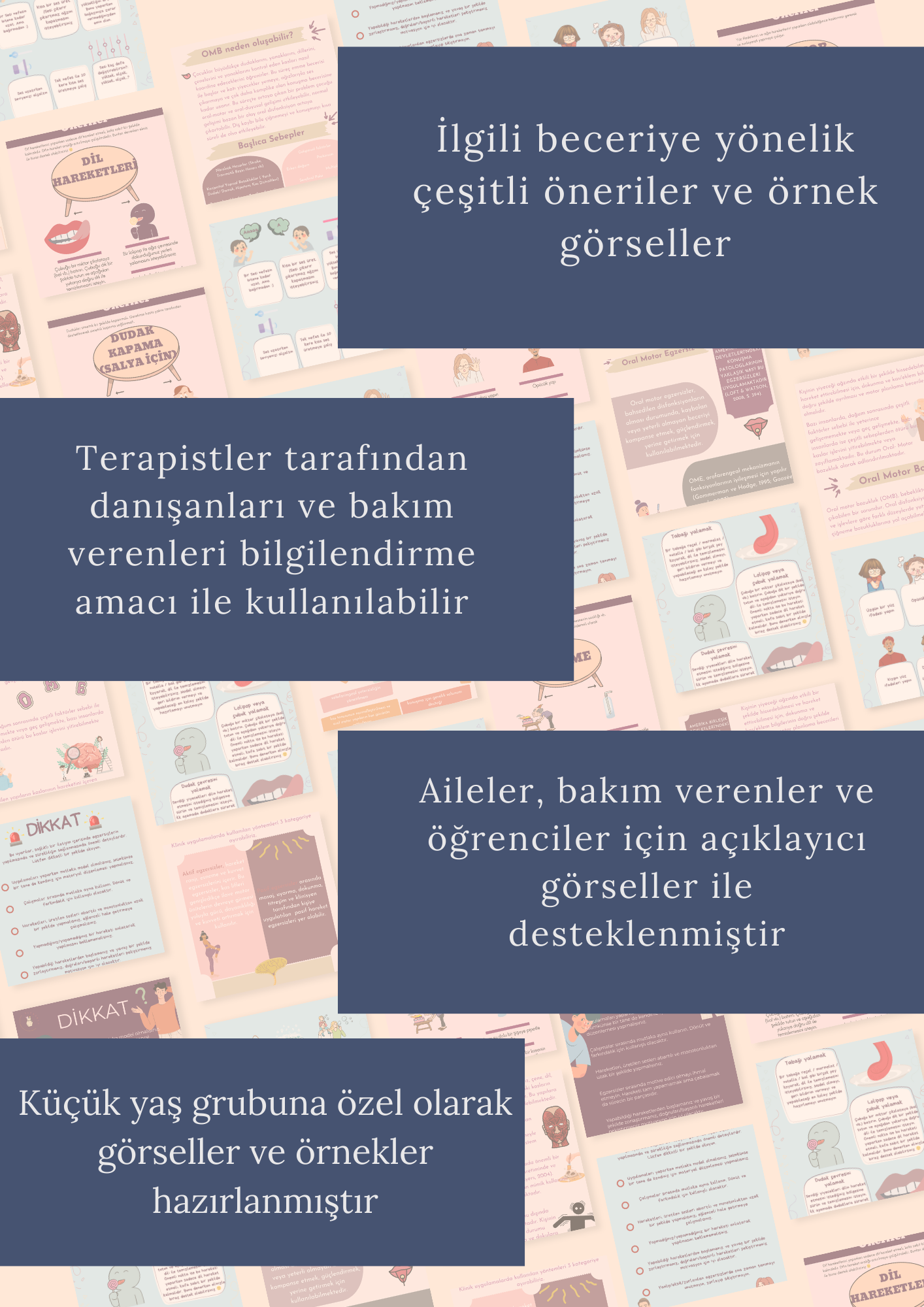 Oral Motor gelişim ve becerilerin desteklenmesi için hazırlanmıştır. Terapistler, öğrenciler, aileler, bakım verenler tarafından çocukların gelişim süreci için kullanılabilecek çeşitli örnekler ve eksiklik olan beceriler için de destekleyicidir. Detaylı açıklamalar ve bir beceri için çeşitli öneriler bulunmaktadır.