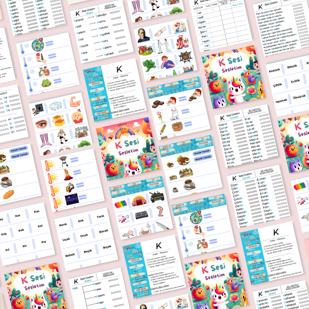 - Sözcük Üretimi ve Tekrar (2 heceli, 3 heceli olarak ayırılmıştır.) ( K sesi sözcük içi pozisyonlarına göre ayrılmıştır)
